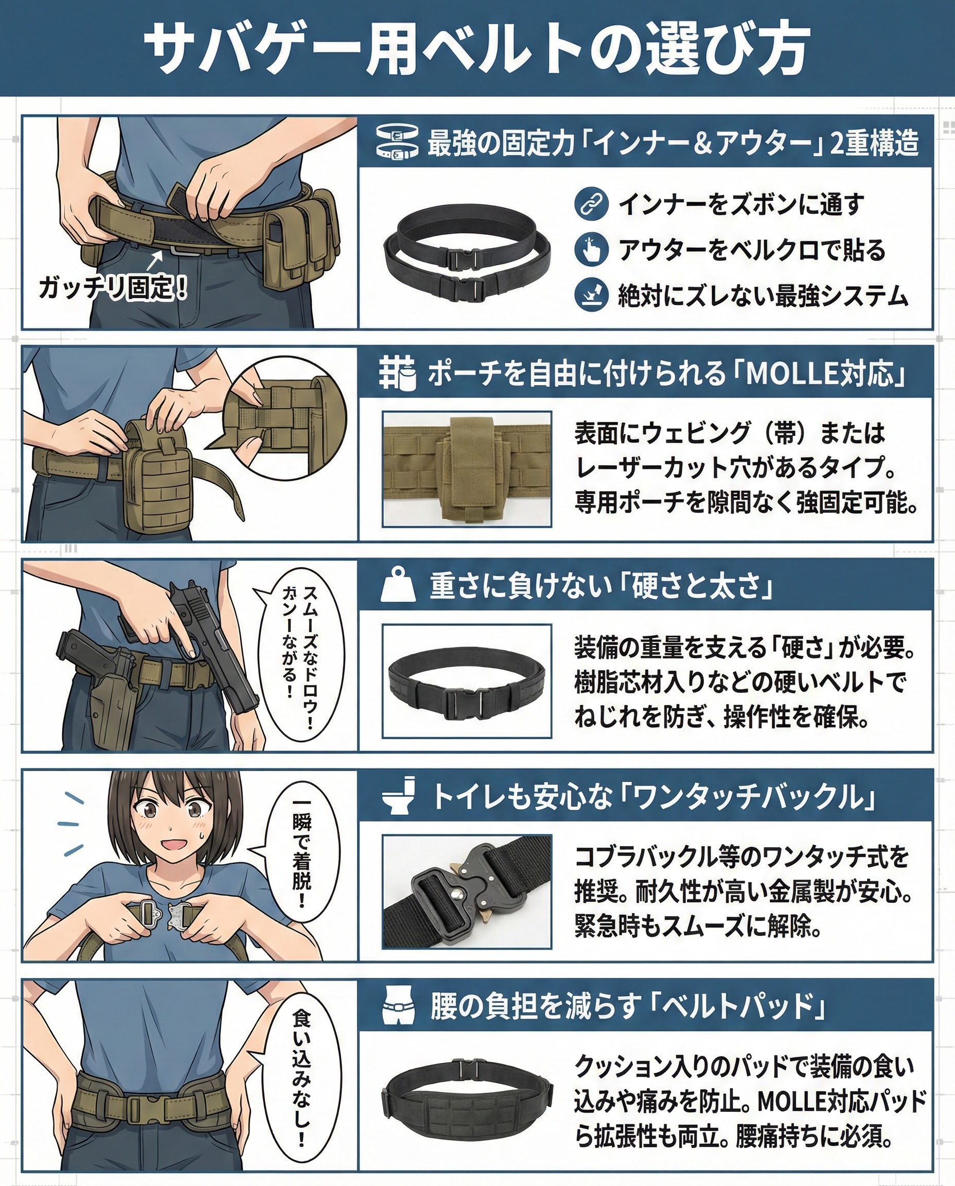 現在、サバゲーマーの間で主流になりつつあるのが「2重構造ベルト」です。ズボンのループに通すベルクロ付きの「インナーベルト」と、装備を付けた「アウターベルト」をバリッと貼り付けて固定します。これにより、走ってもベルトが回らず、ホルスターから銃を抜く時もベルトが持ち上がりません。ファーストライン(腰装備)を組むなら、このタイプが圧倒的に快適です。