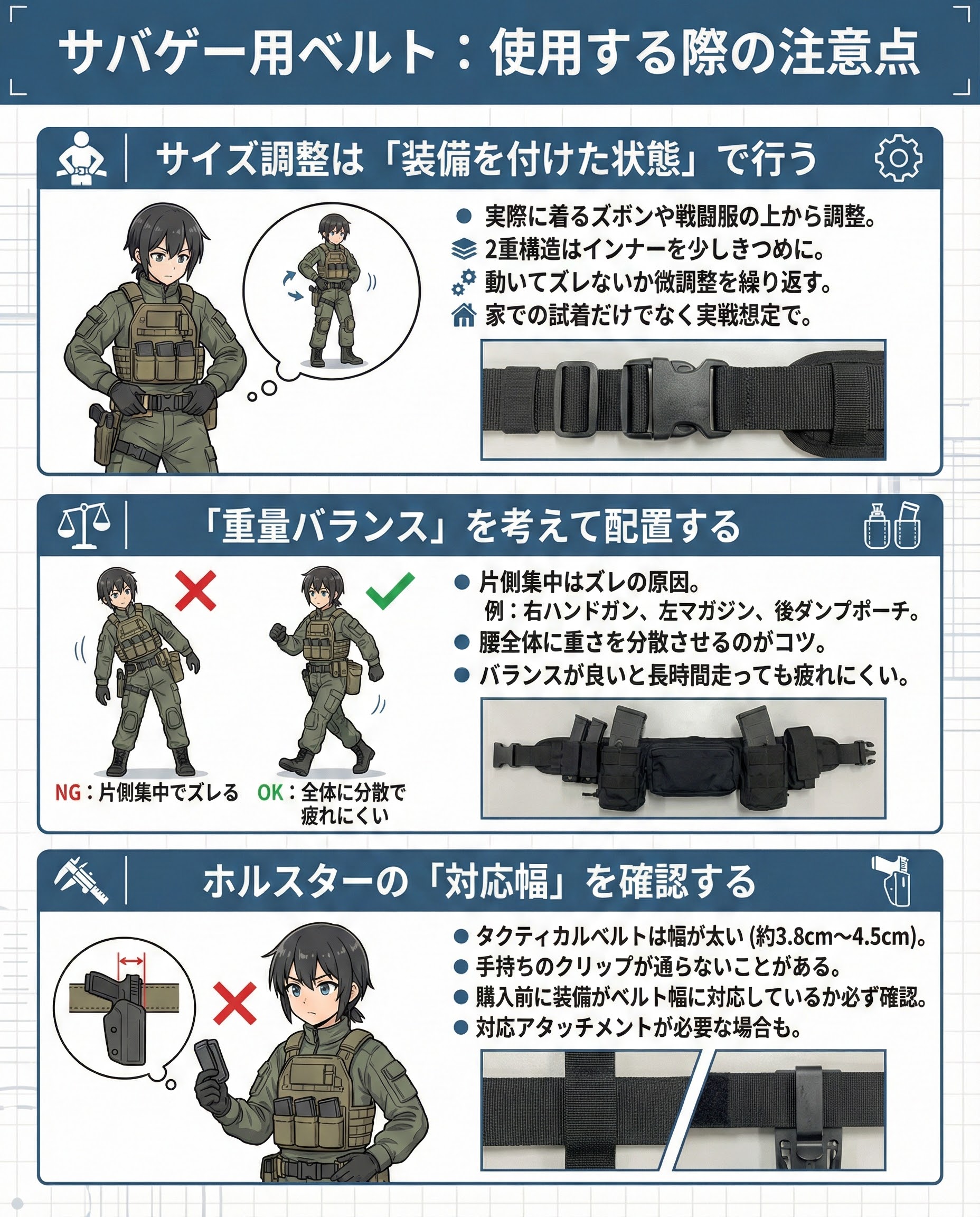 ベルトの長さ調整は、実際にサバゲーで着るズボンや戦闘服の上から行ってください。特に2重構造ベルトの場合、インナーベルトを少しきつめに締めないと、アウターベルトの重みで下がってきます。家での試着だけでなく、実際に動いてみてズレないか確認し、微調整を繰り返すのが快適への近道です。