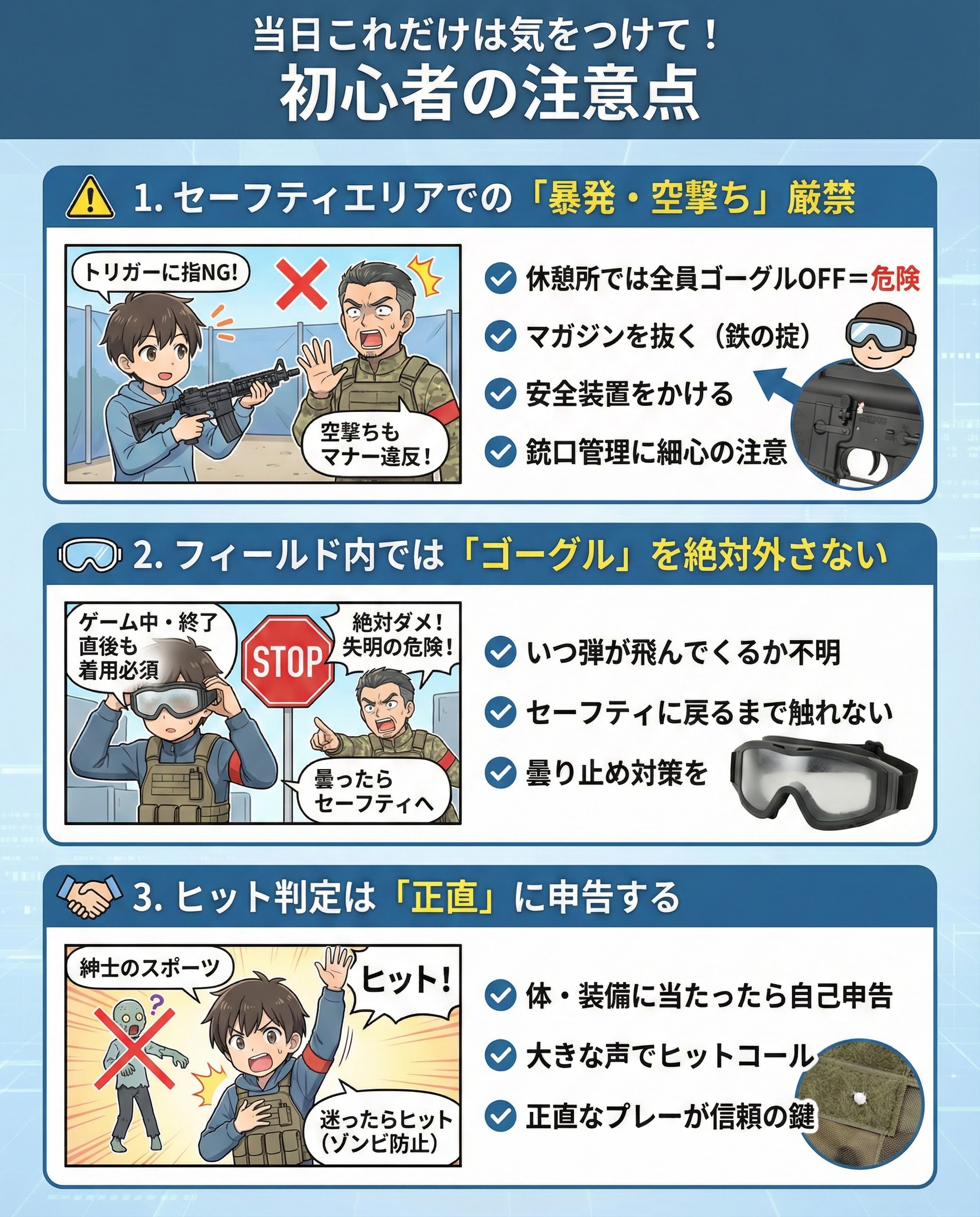 基本的な「ヒットされたら自己申告」「セーフティでは銃口管理」さえ守れば大丈夫です。