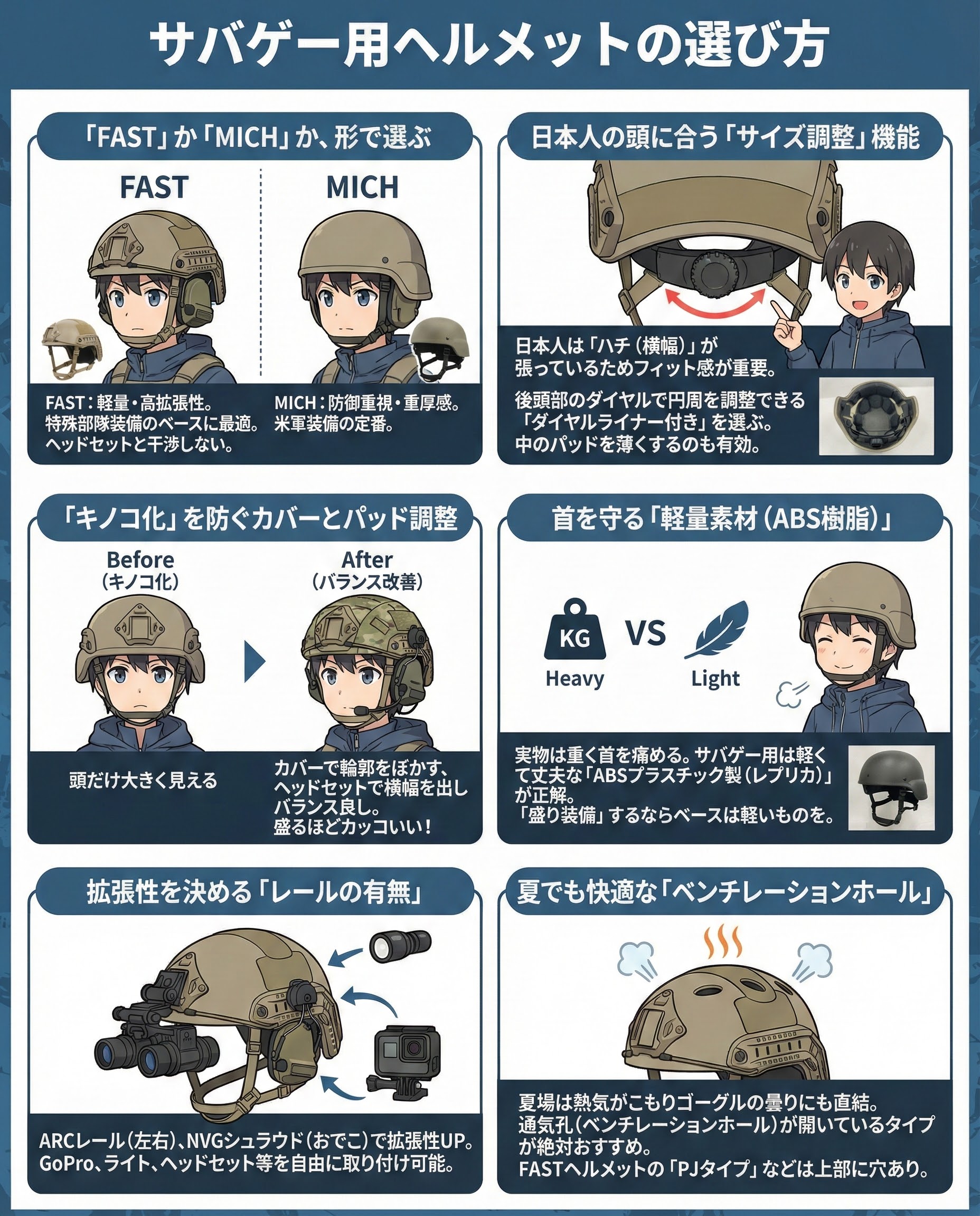 特殊部隊の装備って、ゴテゴテしていて無条件に憧れますよね。「いつかは自分もヘルメットデビューしたい!」と思って意気揚々と被ってみたら、「あれ…なんか頭だけ巨大化してない? マリオのキノコ?」と鏡の前で愕然とした経験、ありませんか? ヘルメットはただ被るだけだとバランスを取るのが難しく、実は「選び方」と「盛り方(セットアップ)」にちょっとしたコツが必要なんです。この記事では、脱・頭でっかちを叶える選び方のポイントを6つ解説し、拡張性抜群のおすすめ16選も紹介します。自分だけの「オペレーター(隊員)スタイル」を完成させて、フィールドで注目を集めましょう。