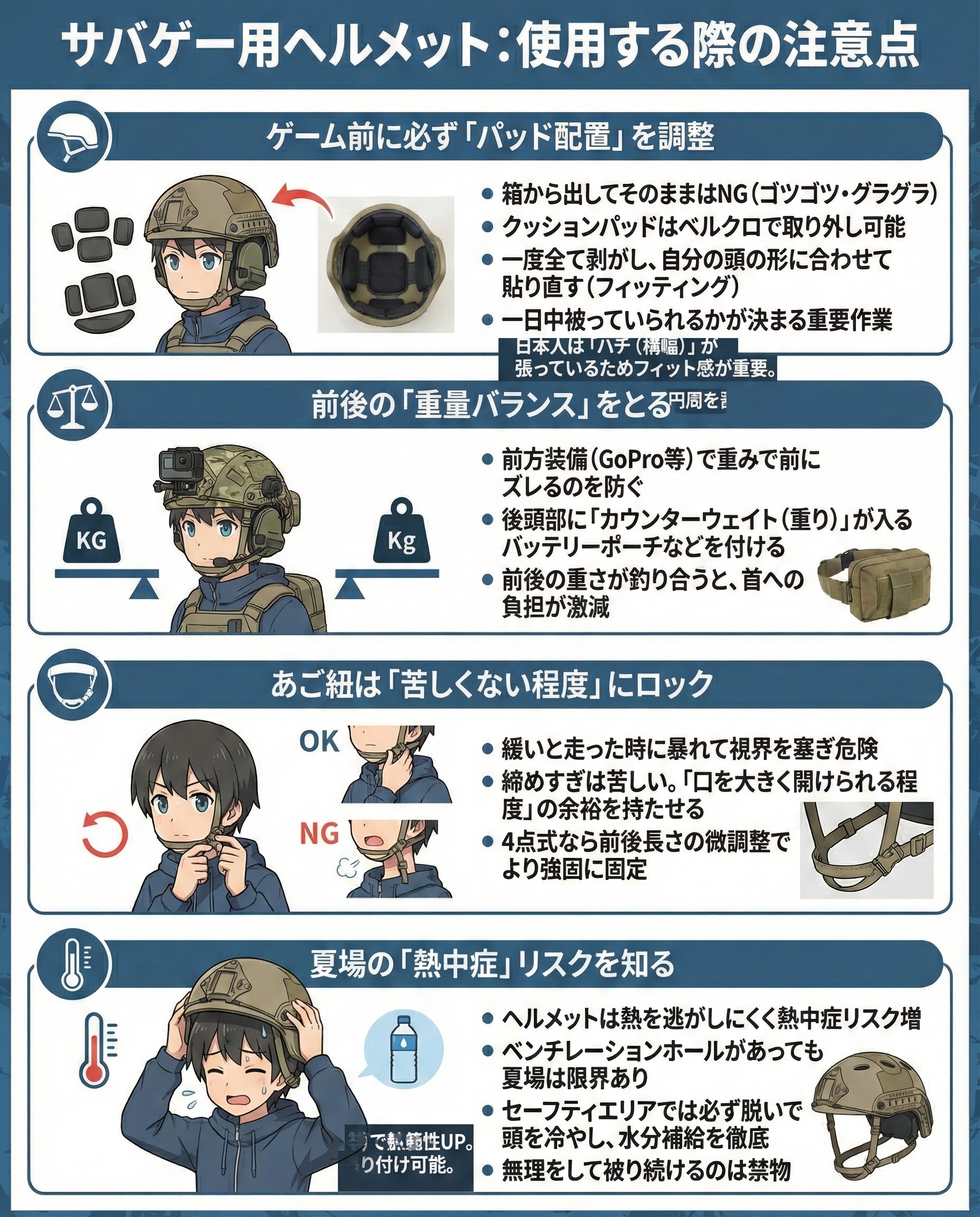 前方にGoProやナイトビジョン(ダミー)を付けると、重みでヘルメットが前にズレてきます。これを防ぐには、後頭部に「カウンターウェイト(重り)」が入るバッテリーポーチなどを付けてバランスを取るのが定石。前後の重さが釣り合うと、驚くほど首への負担が減ります。