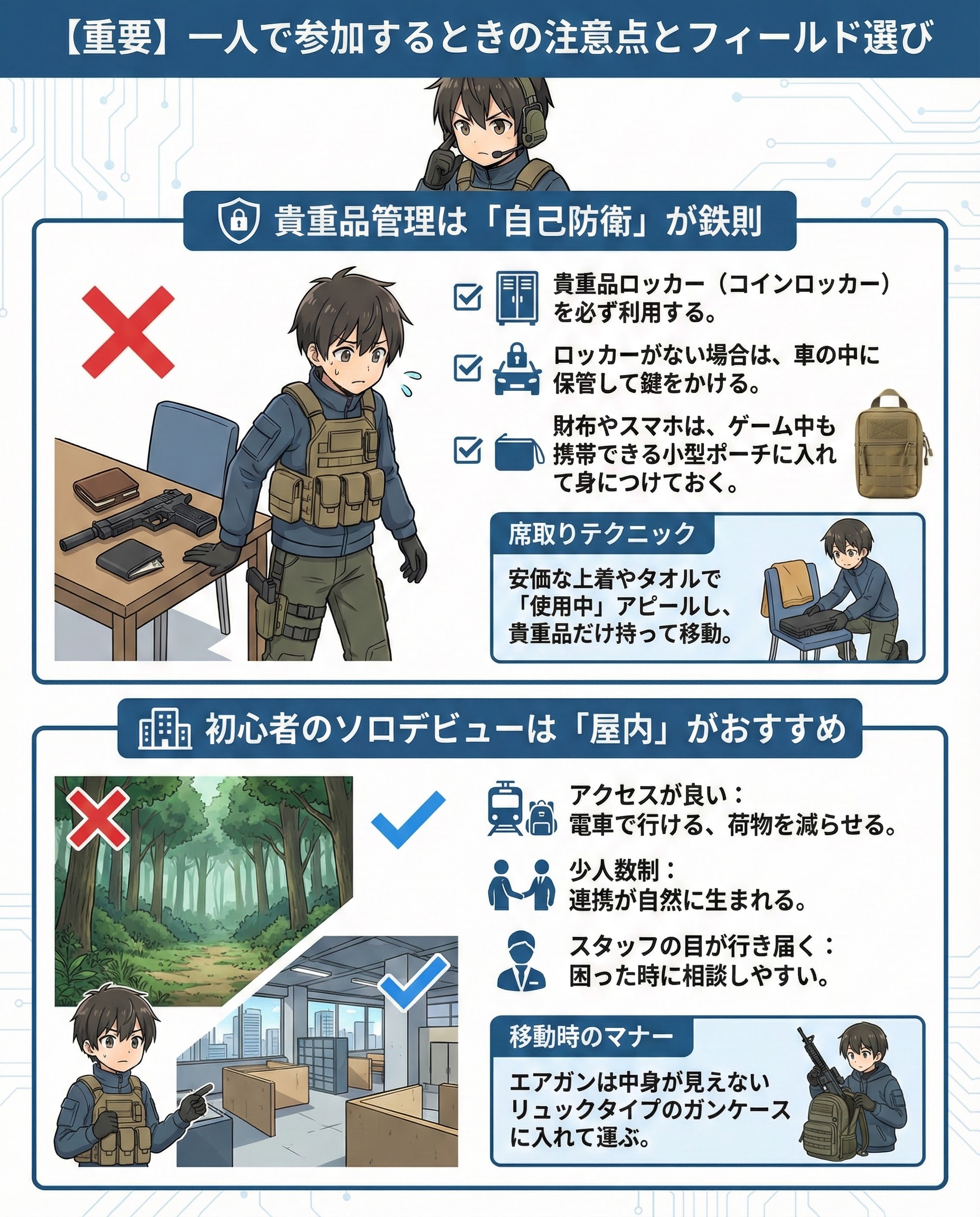 一人の場合、トイレや買い物で席を立つ際に荷物番がいません。高価なエアガンや財布をテーブルに置きっぱなしにするのは絶対にNGです。以下の対策を徹底しましょう。