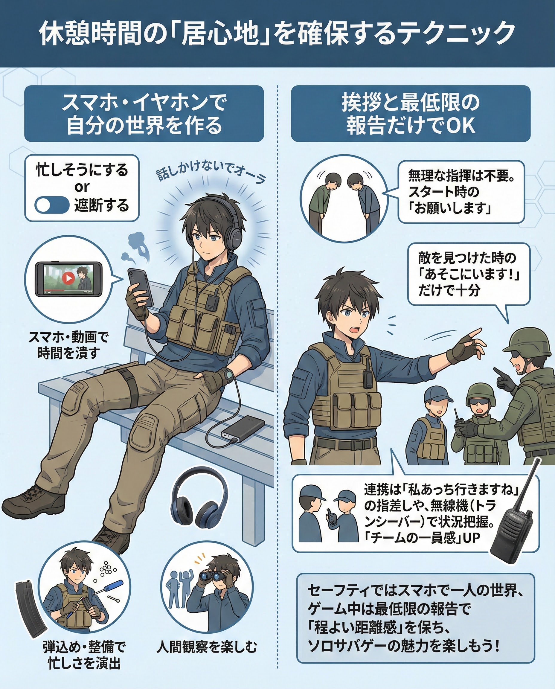 ソロ参加で一番不安なのが「セーフティエリア(休憩所)での過ごし方」でしょう。周りがワイワイしている中、一人で座っているのが辛いと感じるかもしれませんが、対策は簡単です。「忙しそうにする」か「遮断する」です。次のゲームの弾込めを念入りに行ったり、モバイルバッテリーを繋いでスマホで動画を見たりしていれば、誰も気にしません。イヤホンをしておけば「話しかけないでオーラ」も自然に出せます。