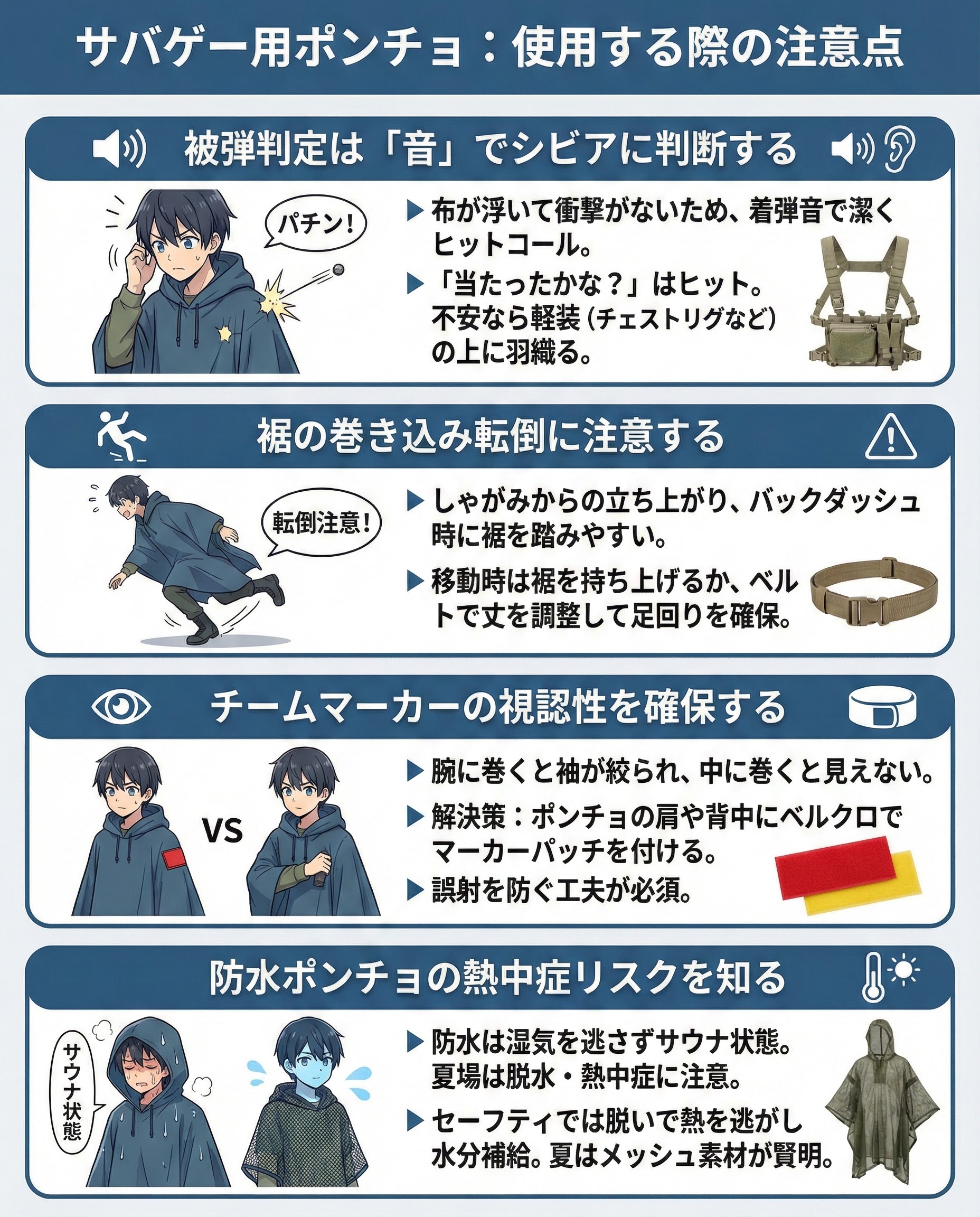 ポンチョ装備で一番怖いのが「ゾンビ行為」です。布が浮いている部分に当たると、体への衝撃はほぼありません。「パチン」という着弾音がしたら、痛みを感じなくても潔くヒットコールをしましょう。「当たったかな?」と迷ったらヒット。この潔さが、カッコいいポンチョ使いの条件です。不安な場合は、チェストリグなど軽装の上に羽織ることをお勧めします。