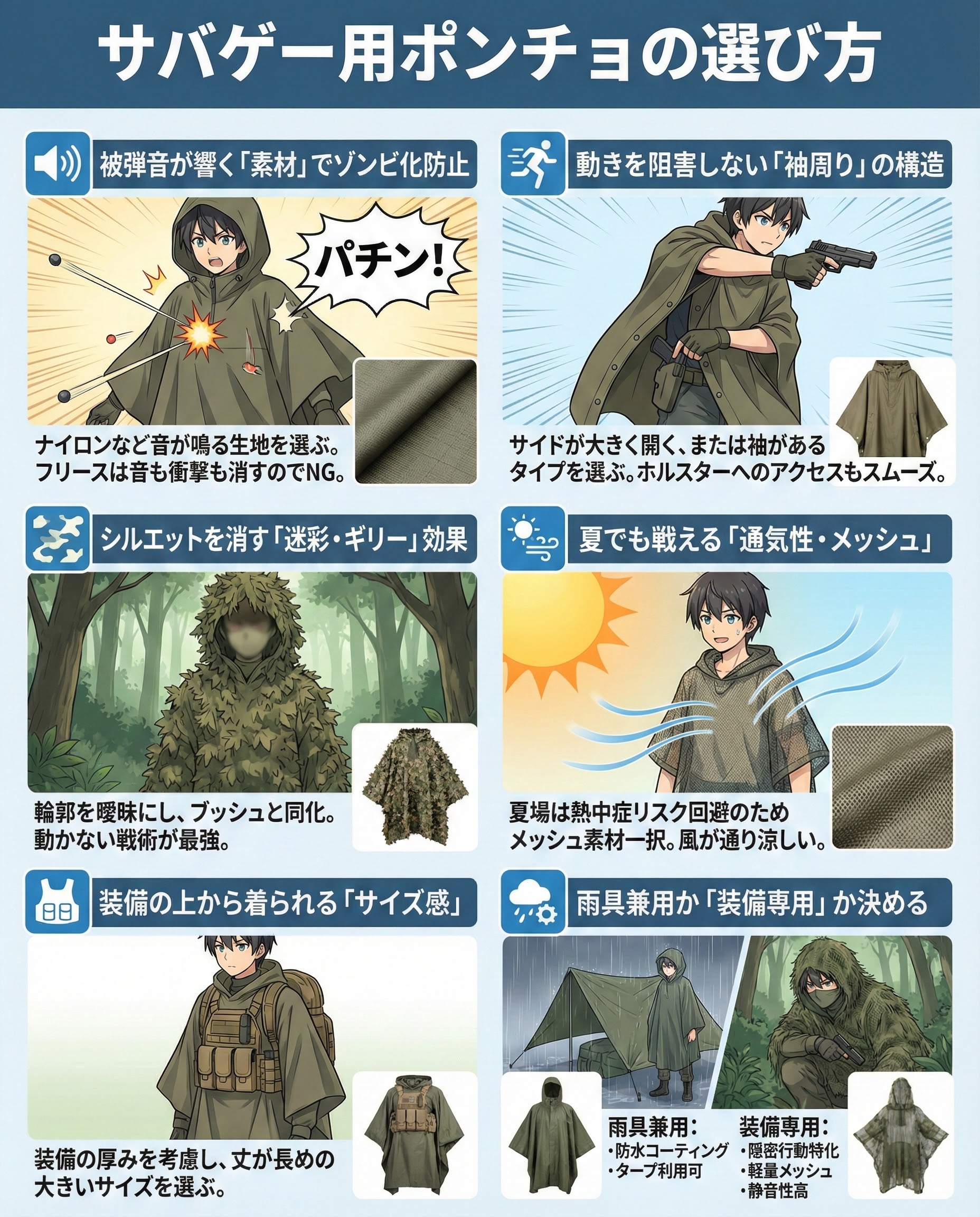 フィールドでポンチョを靡(なび)かせているスナイパー、独特の「強キャラ感」があって憧れますよね。でも、「撃たれたことに気づかないんじゃない?」「マガジン交換しにくそう」といった不安から、手が出せない人も多いはず。この記事では、ゾンビ行為を防ぎつつスタイリッシュに戦うためのポンチョの選び方を6つのポイントで解説し、憧れを叶えるおすすめ14選も紹介します。