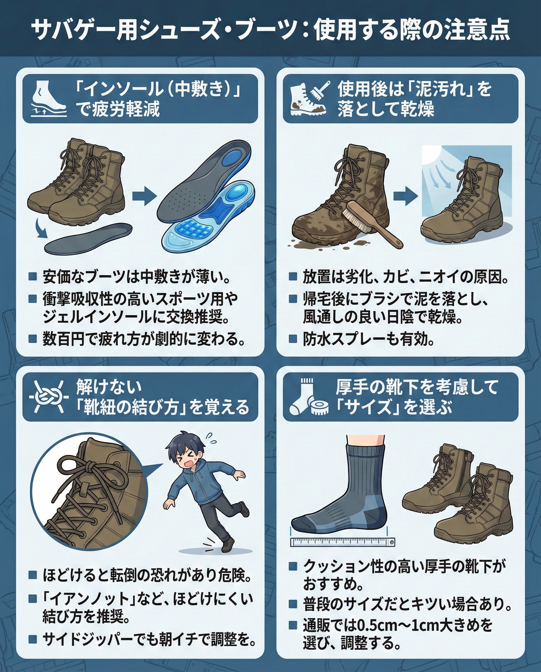 安価なタクティカルブーツは、中敷きがペラペラなことが多いです。そのまま使うと足の裏が痛くなり、後半のゲームで動けなくなることも。衝撃吸収性の高いスポーツ用やジェルインソールに入れ替えるだけで、疲れ方が劇的に変わります。数百円の投資で効果絶大なので、ぜひ交換しましょう。