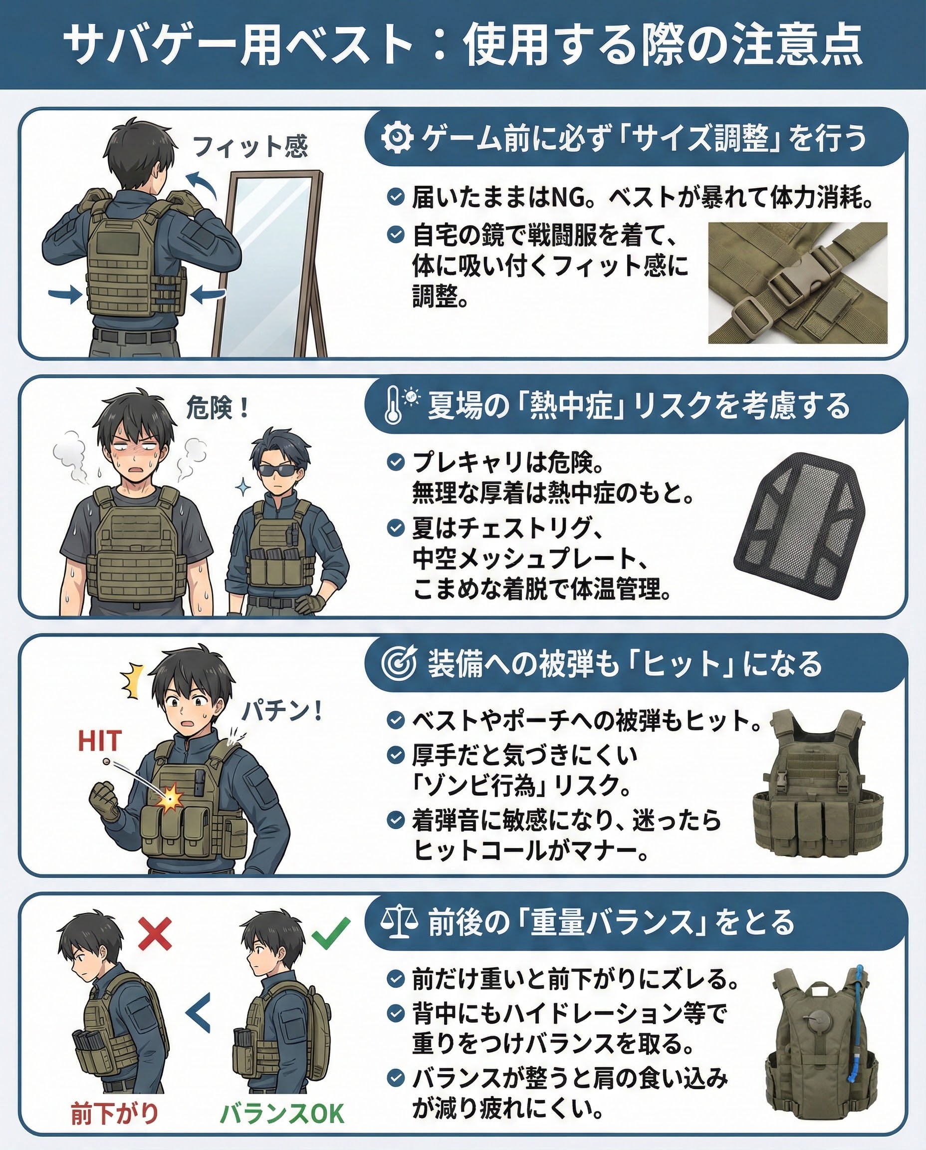 プレキャリは防寒着並みに暖かいので、夏場は危険です。無理して厚着をすると、熱中症で倒れてしまうことも。夏は背中が空いているチェストリグにする、ダミープレートを中空のメッシュタイプに変える、あるいは休憩中にこまめに脱ぐなど、体温管理を徹底してください。